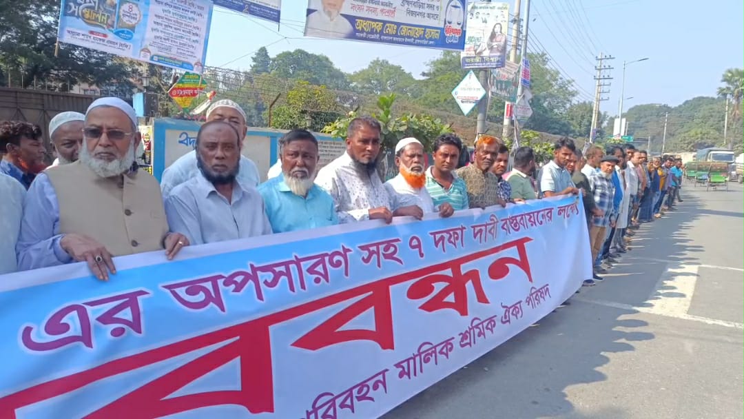 ব্রাহ্মণবাড়িয়ায় ট্রাফিক ইন্সপেক্টর মীর আনোয়ারের অপসারণ ও অনিয়ম বন্ধসহ সাত দফা দাবিতে পরিবহন শ্রমিকদের মানববন্ধন
