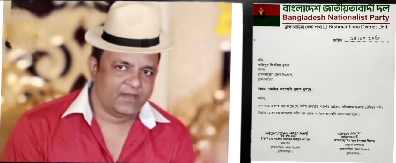 ব্রাহ্মণবাড়িয়া জেলা বিএনপির সদস্য সাজিদুল কিবরিয়া সুজনকে সাময়িক অব্যাহতি দেওয়া হয়েছে। সোমবার জেলা বিএনপির সভাপতি ইঞ্জিনিয়ার খালেদ হোসেন মাহবুব শ্যামল