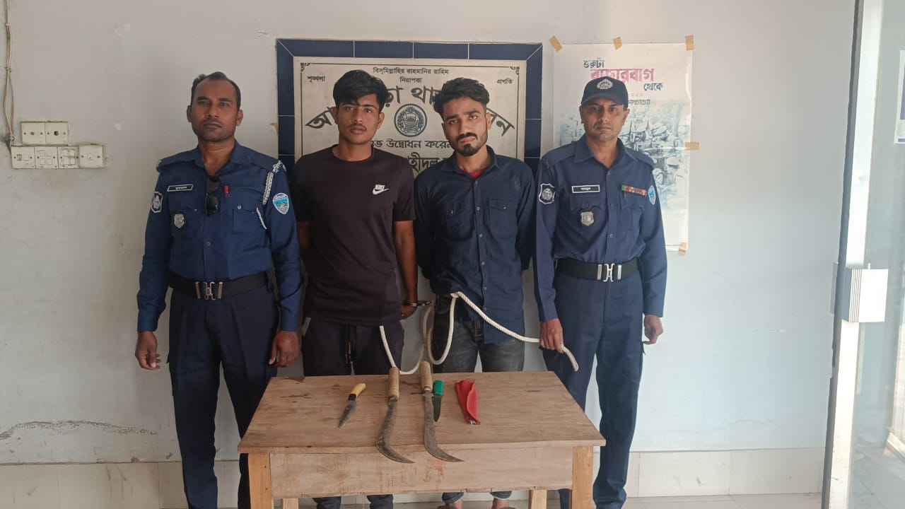 ব্রাহ্মণবাড়িয়ার আখাউড়ায় ডাকাতির প্রস্ততিকালে দেশীয় অস্ত্রসহ মাইনুল ইসলাম জুয়েল ও মোঃ ইমান হোসেন নামে ডাকাত দলের দুই সদস্যকে গ্রেফতার করেছে