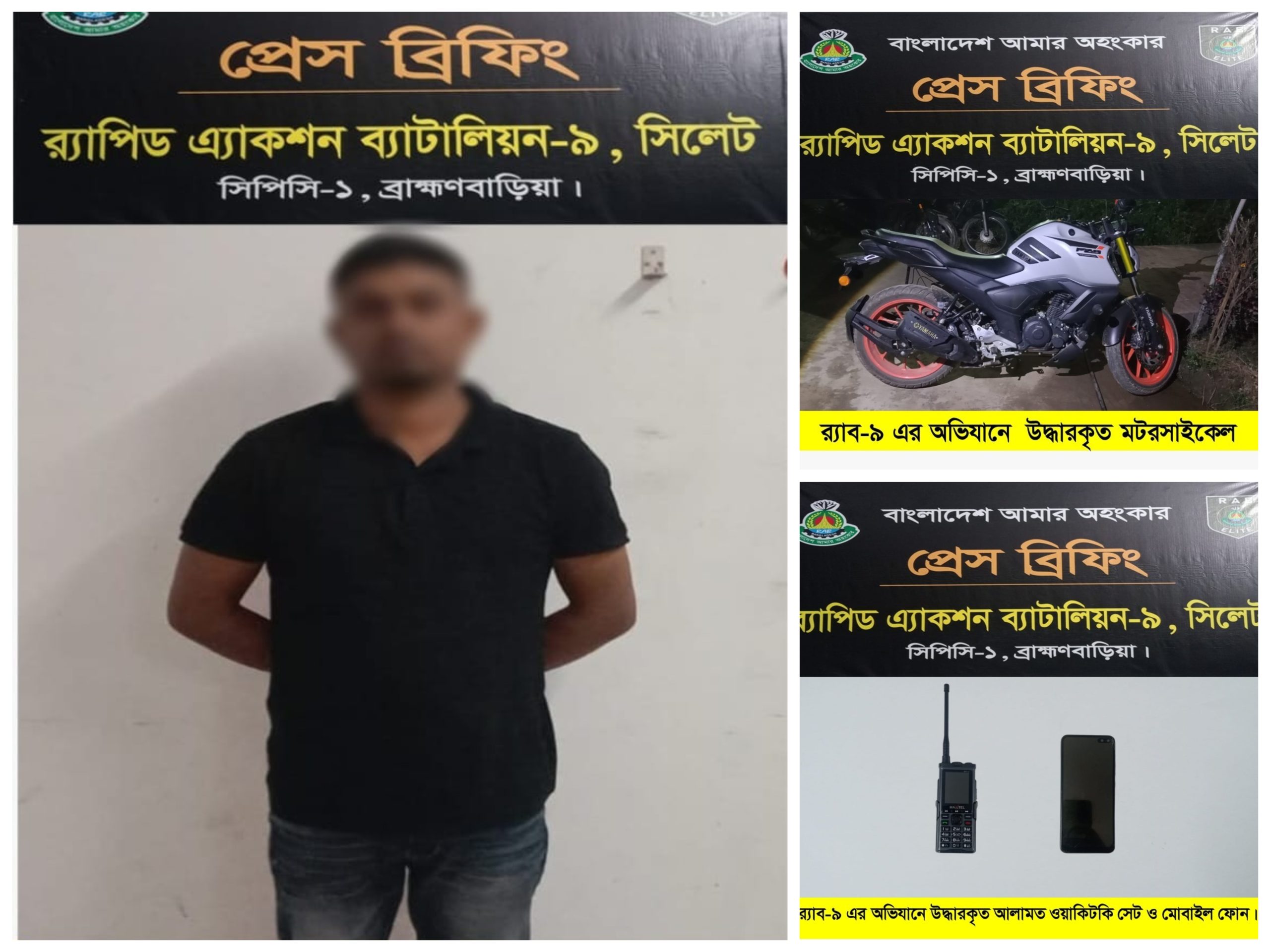 র্যাপিড অ্যাকশন ব্যাটালিয়ন-৯ (র্যাব-৯) এর অভিযানে ব্রাহ্মণবাড়িয়ার বিজয়নগর উপজেলায় ভূয়া র্যাব সদস্য পরিচয়ে সরকারি কাজে বাধাদানের অভিযোগে এক যুবককে গ্রেফতার বিস্তারিত..