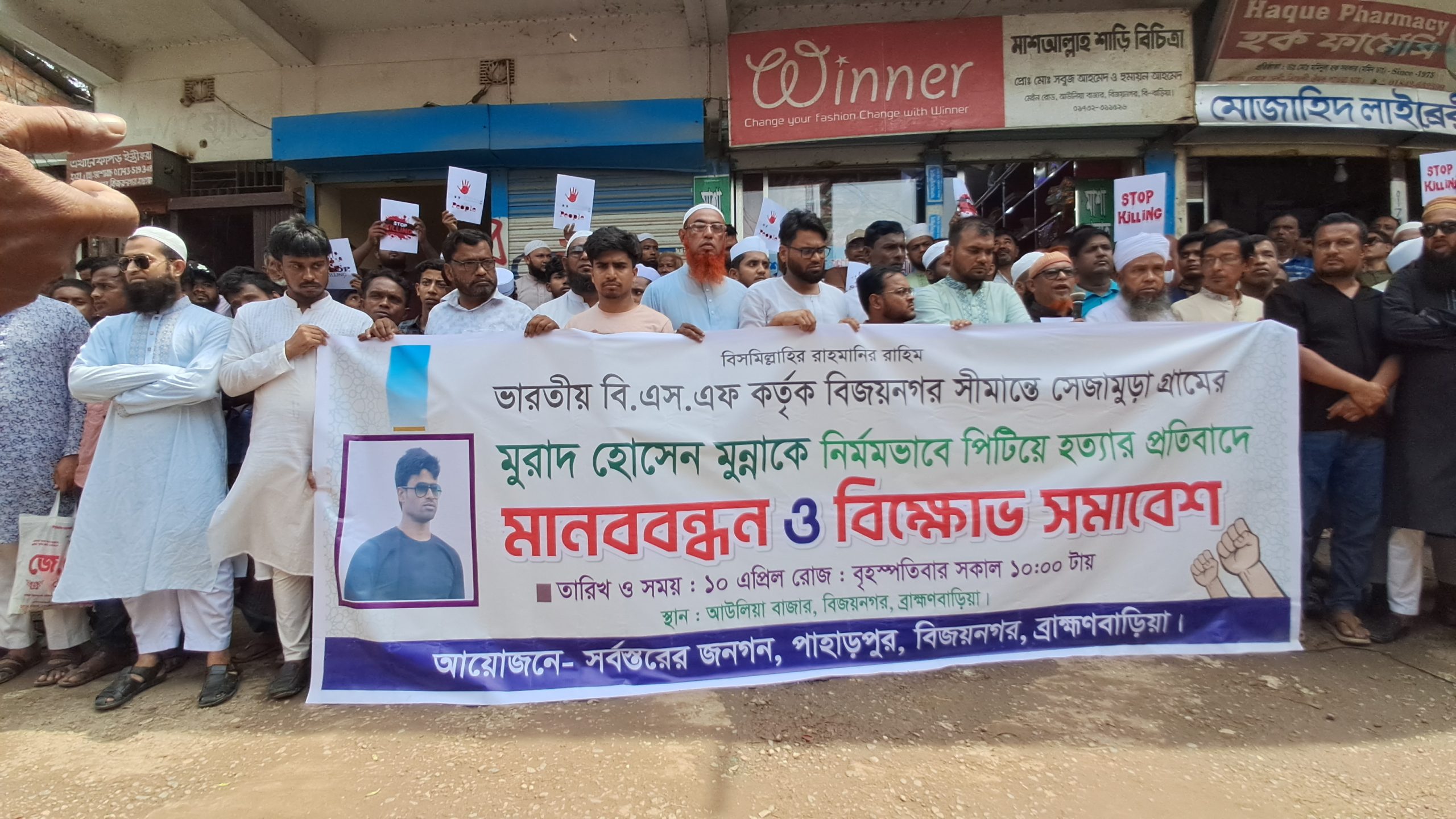 সীমান্তরক্ষী বাহিনী (বি.এস.এফ) হাতে ব্রাহ্মণবাড়িয়ার বিজয়নগর উপজেলার সেজামুড়া গ্রামের মুরাদ হোসেন মুন্নাকে নির্মমভাবে পিটিয়ে হত্যার প্রতিবাদে মানববন্ধন ও বিক্ষোভ সমাবেশ