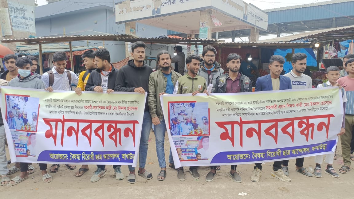 আখাউড়ায় আ.লীগের দোষর শিক্ষকের অপসারণ চেয়ে শিক্ষার্থীদের মানববন্ধন।