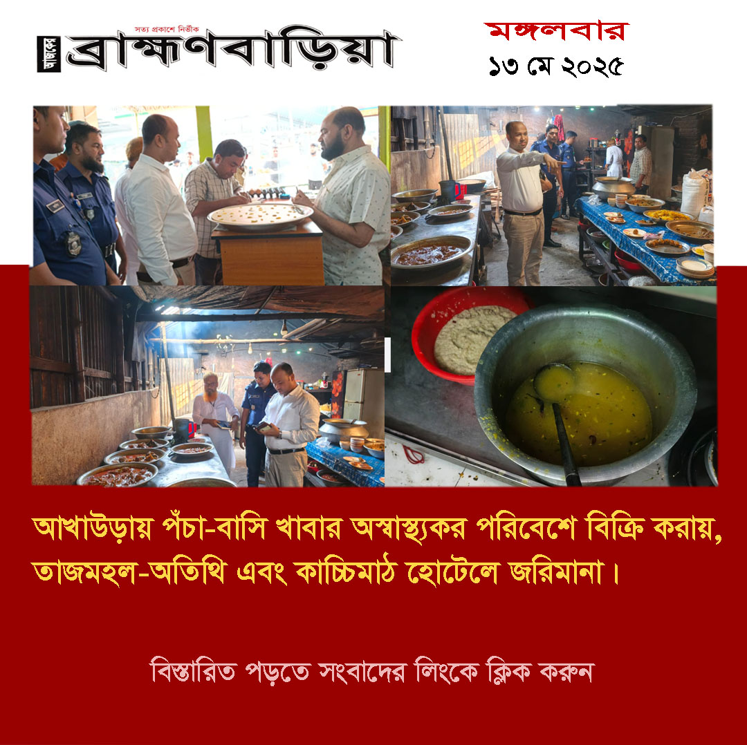 ব্রাহ্মণবাড়িয়ার আখাউড়ায় প্রতিনিয়িত পঁচা-বাসি খাবার অস্বাস্থ্যকর পরিবেশে বিক্রি করার দায়ে তাজমহল হোটেল-অতিথি হোটেল এবং কাচ্চি মাঠ নামক তিনটি হোটেল মালিককে